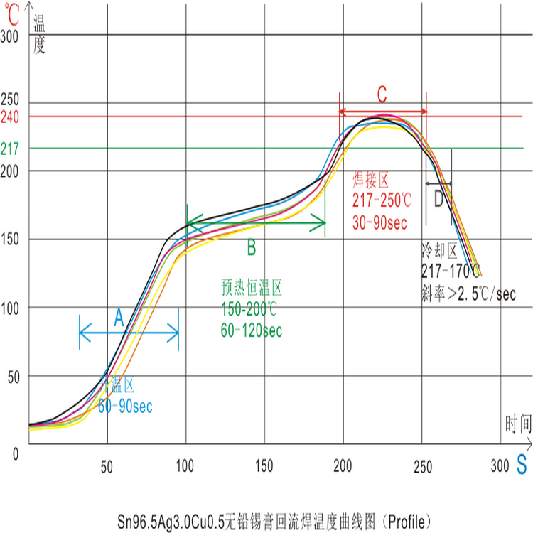 温度曲线是指SMA经过回流炉时,SMA上某一点的温度随时刻改变的曲线。温度曲线供给了一种直观的办法,来剖析某个元件在整个回流焊过程中的温度改变状况。这关于取得最好的可焊性,避免因为超温而对元件构成损坏,以及确保焊接质量都非常有用。温度曲线选用炉温测验仪来测验,当前市道上有很多种炉温测验仪供使用者挑选。
